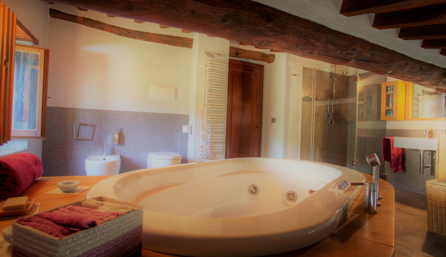 Into the sleeping zone to two well furnished double bedrooms, one of which has an ante room of wardrobes. Also on this floor is a large bathroom with tub, as well as a separate shower room. Each room has wonderful beamed ceilings adding to the Tuscan feel.