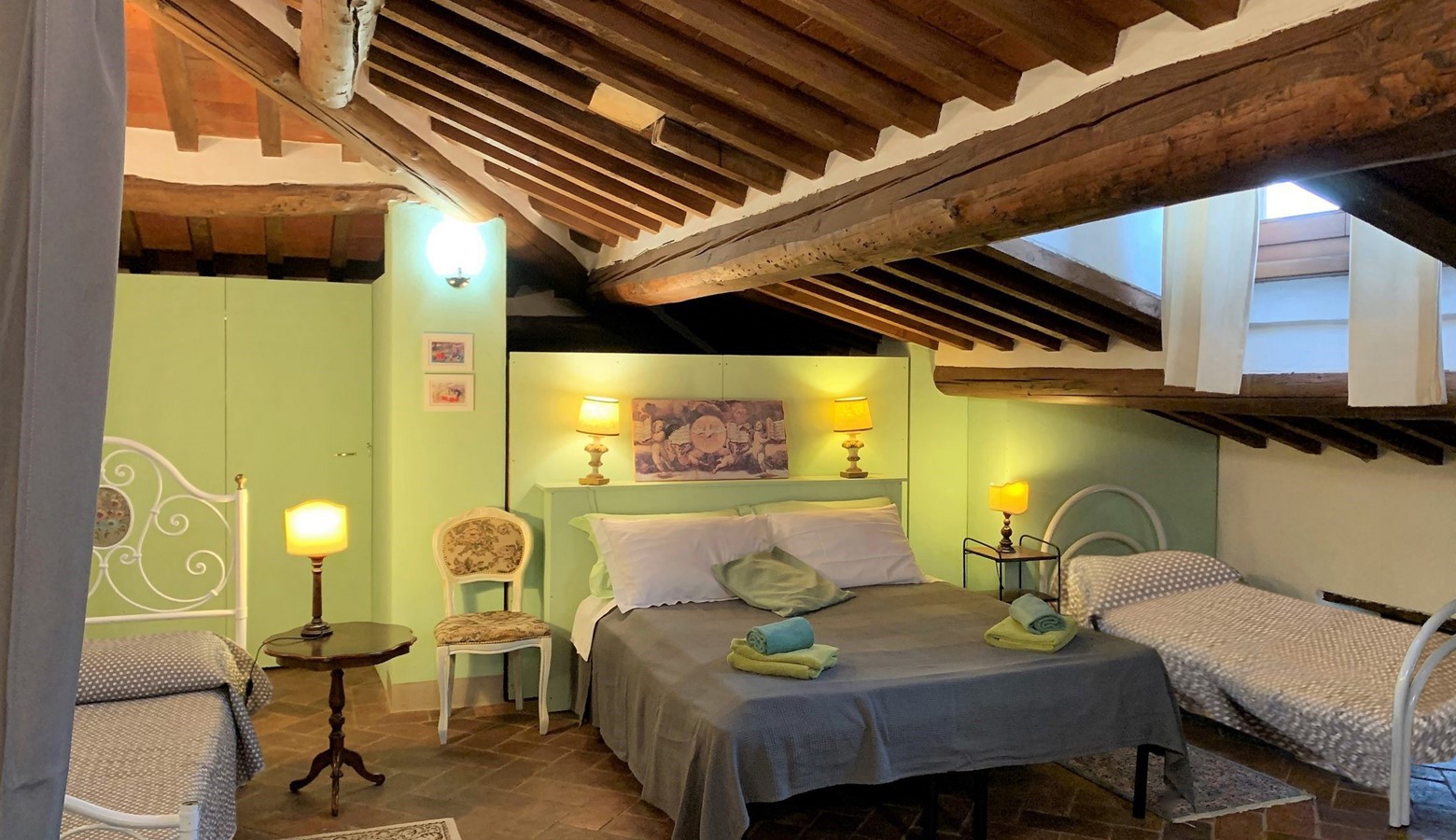 Up to the second floor one finds a further living area, with room to relax away from the rest of the group, along with a further 2 double bedrooms with beamed ceilings. There is space for an additional single in each room, but many guests prefer to situate the 2 singles in with the largest double so that 4 children can all sleep together, or else place the 2 singles in the additional living area on this 'loft style' floor. There is a large bathroom with hydromassage bath and separate shower. Due to layout, this floor will suit one family.