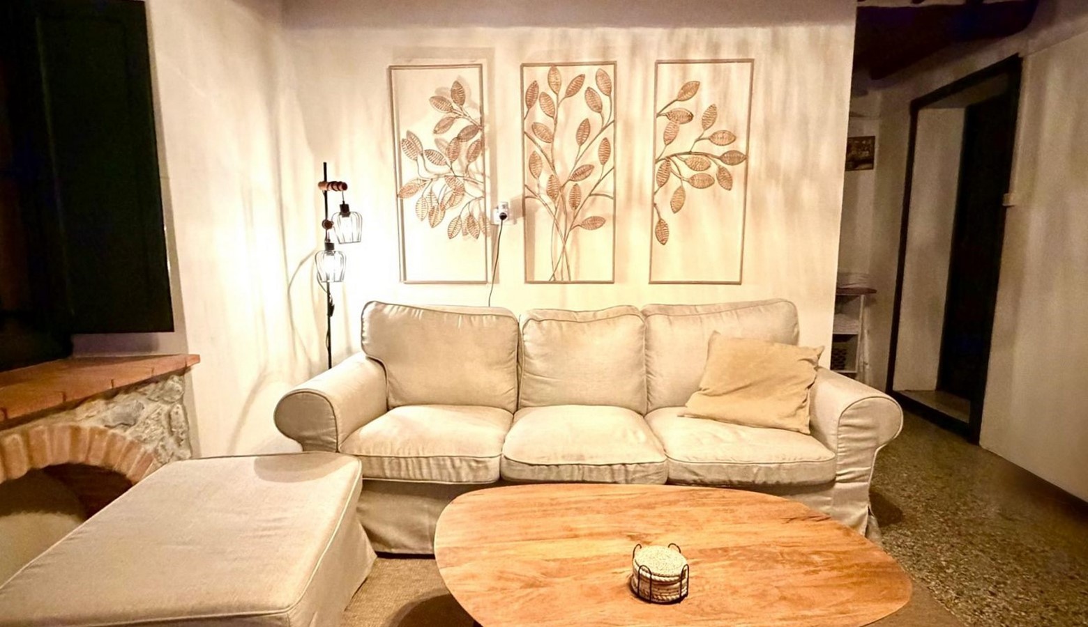 • Spacious living room with sofas, Smart TV, and wood-burning