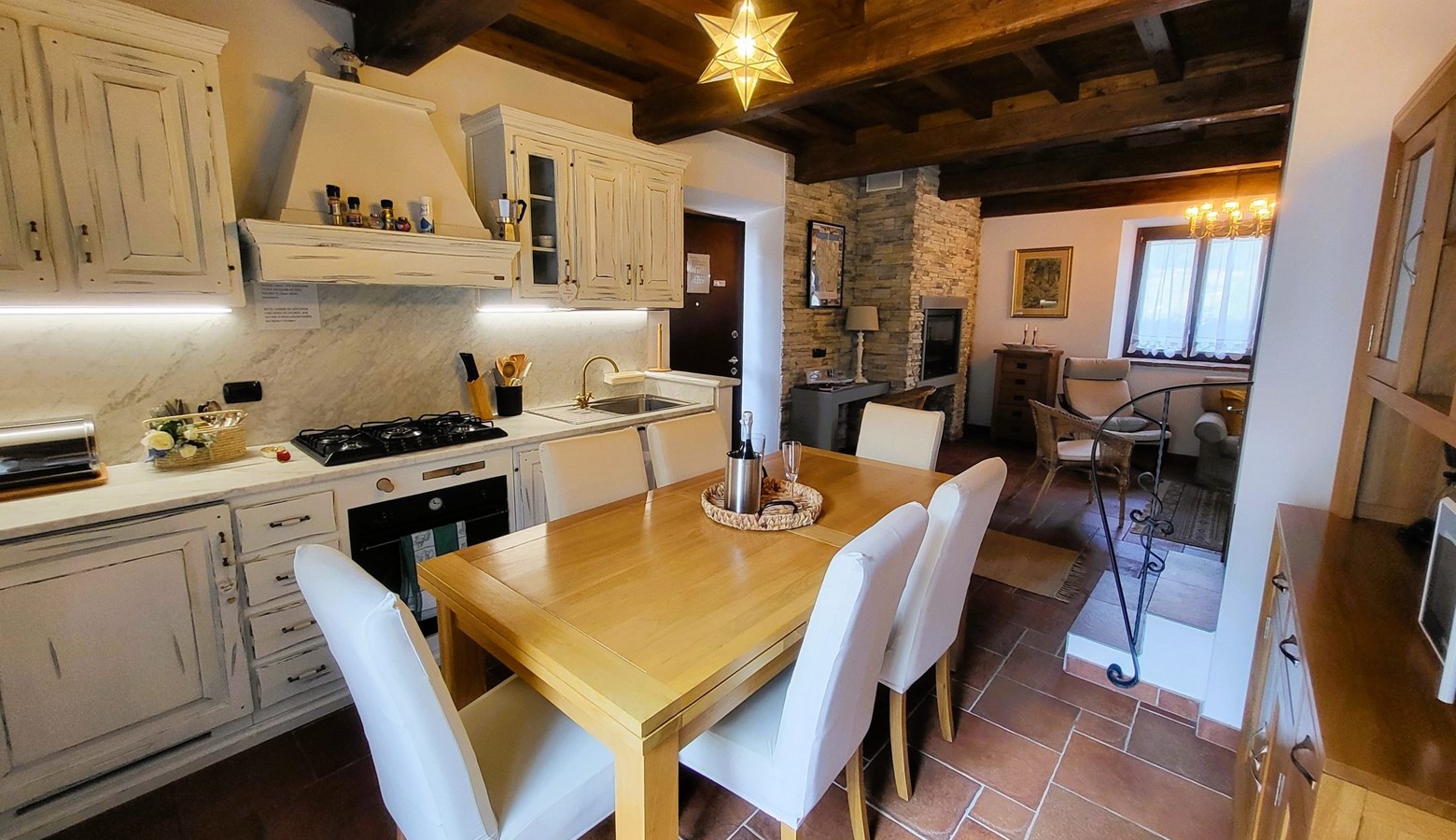 - There are beamed ceilings and traditional flooring.