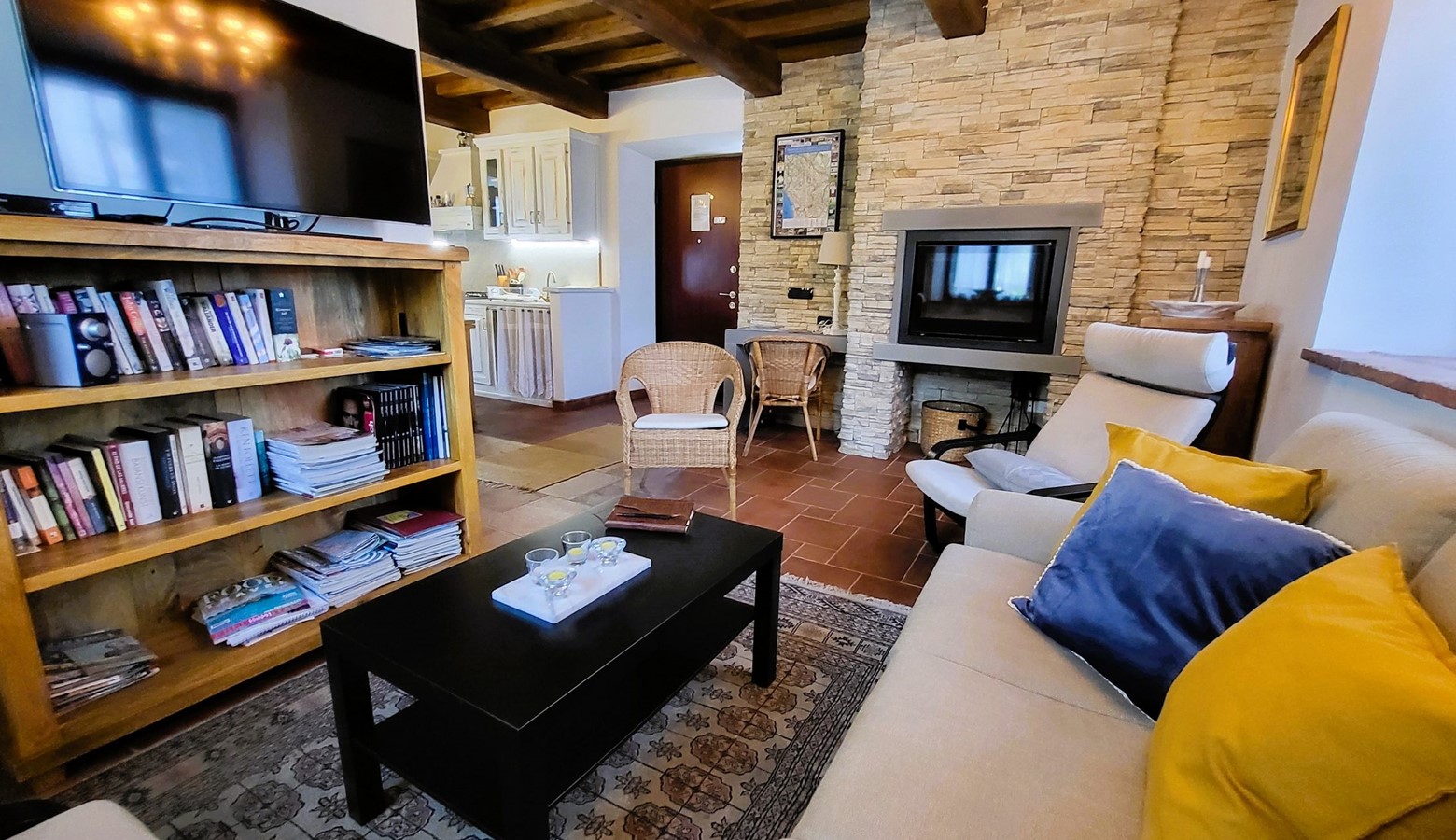 - Living area with comfy seating, wood fireplace, TV, WIFI.....