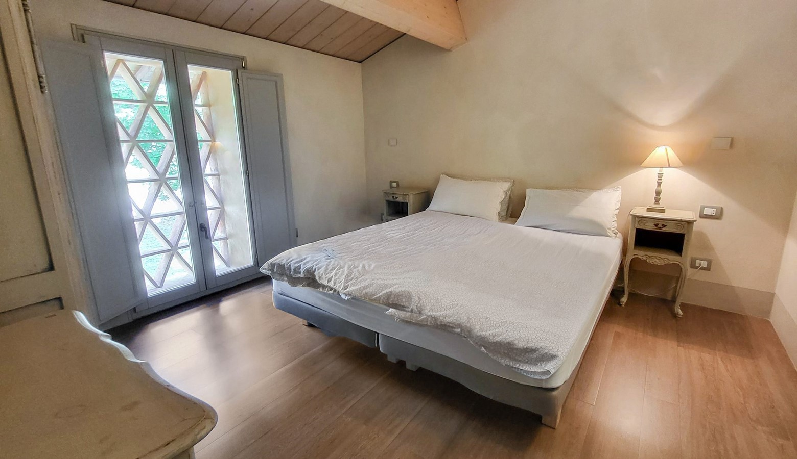 double room with beamed ceilings and large window. Large modern