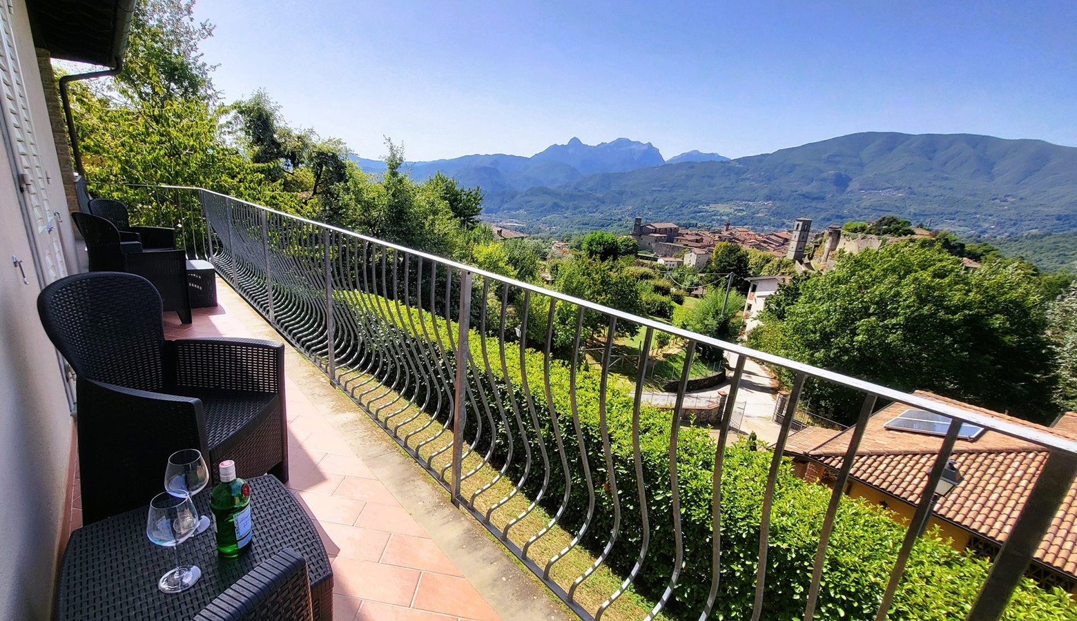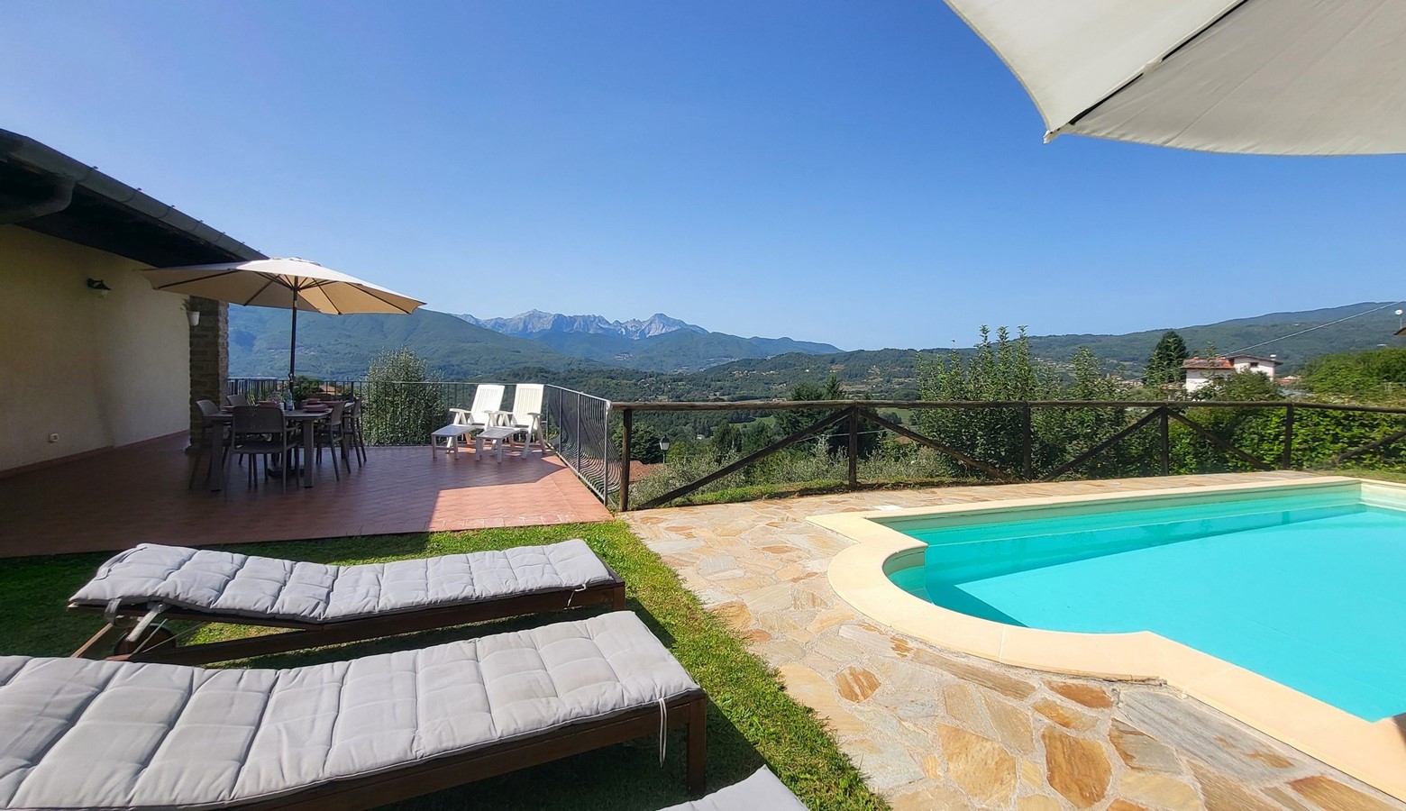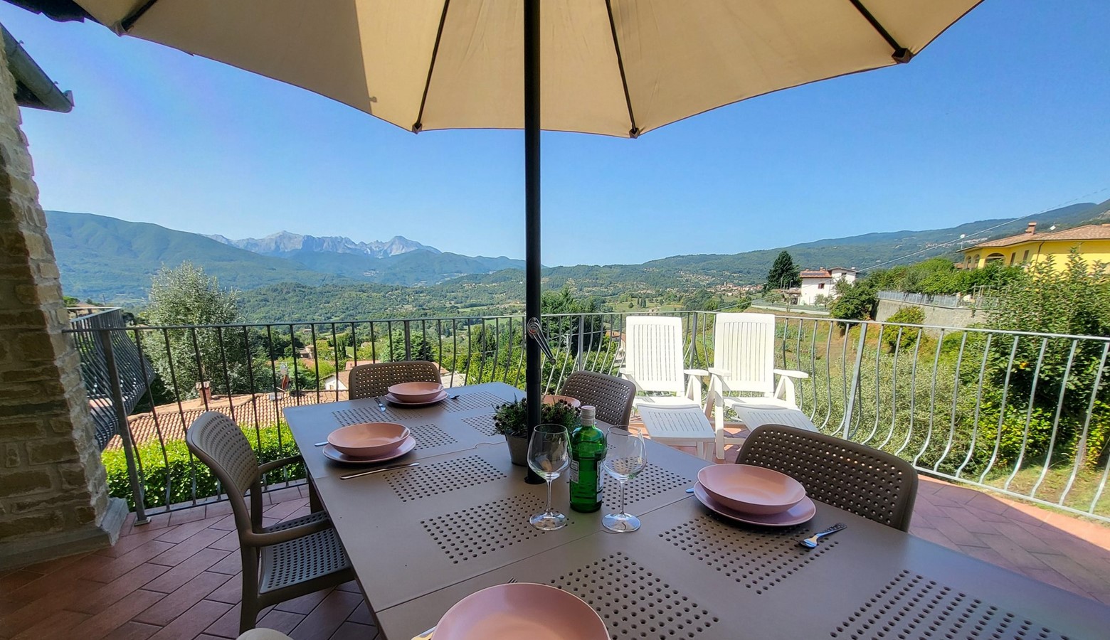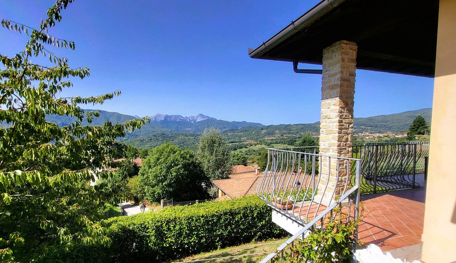 Monte pigoli is a sympathetically restored italian villa, benefiting from the most amazing views over the apuane mountains. There is a balcony sweeping around the villa taking in that vista, and the kitchen, dining area, and two of the bedrooms lead directly out to the balcony, giving a really romantic feel to the house, with the 4th bedroom leading straight to the garden to get those views too!