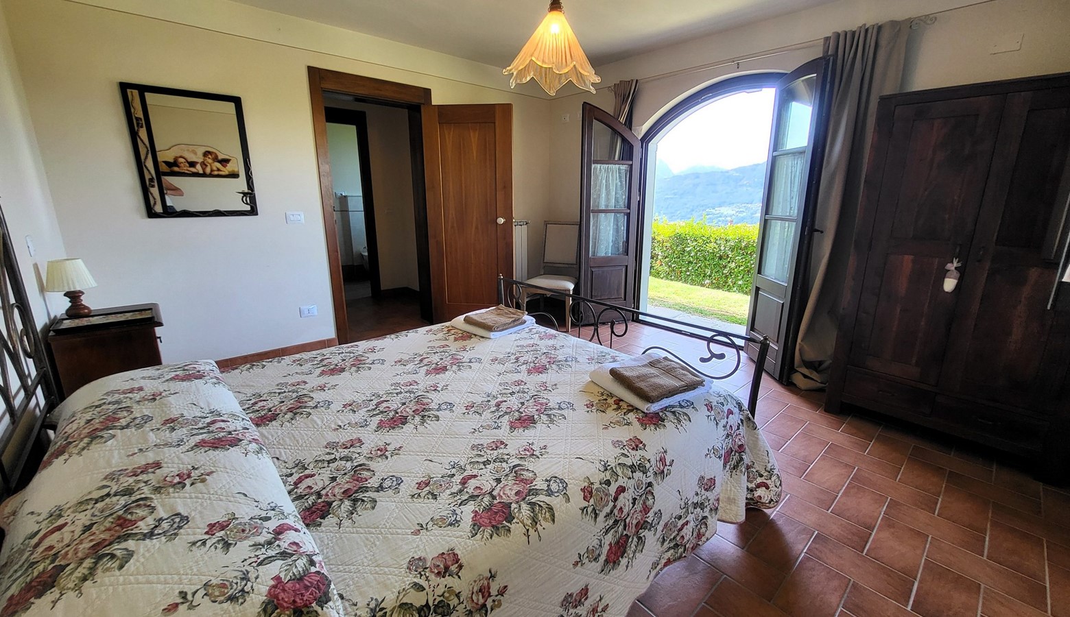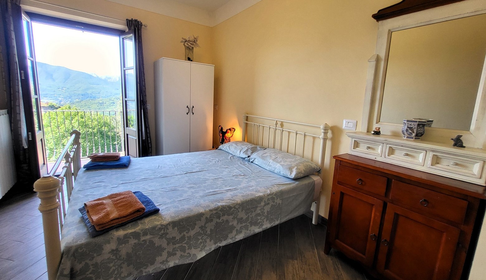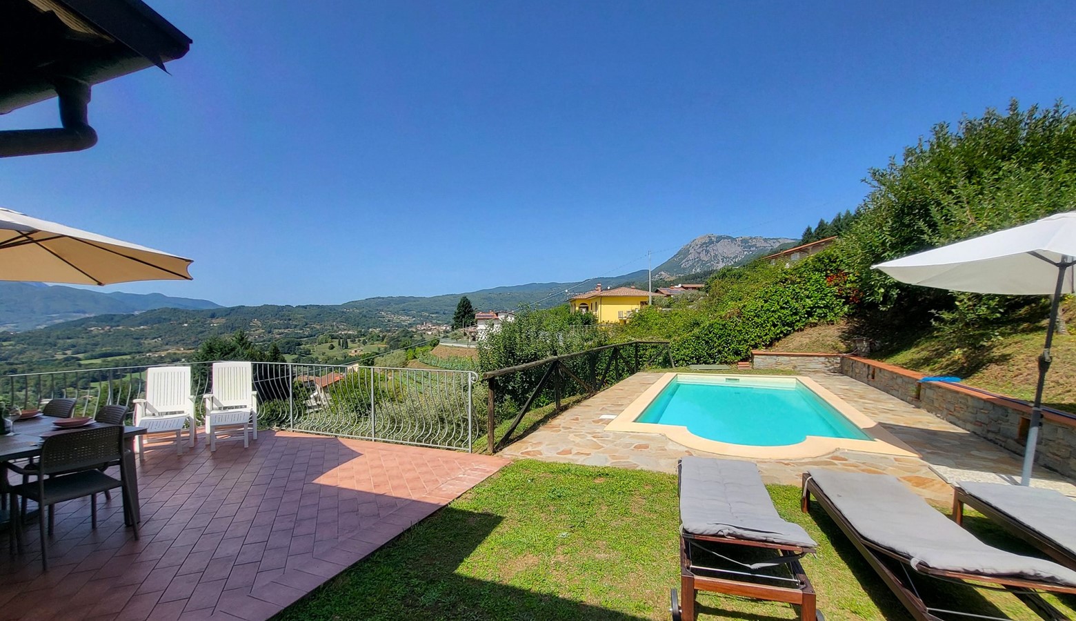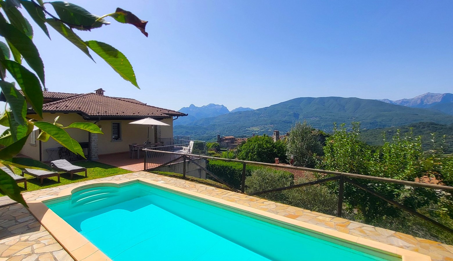 Monte pigoli is a sympathetically restored italian villa, benefiting from the most amazing views over the apuane mountains. There is a balcony sweeping around the villa taking in that vista, and the kitchen, dining area, and two of the bedrooms lead directly out to the balcony, giving a really romantic feel to the house, with the 4th bedroom leading straight to the garden to get those views too!