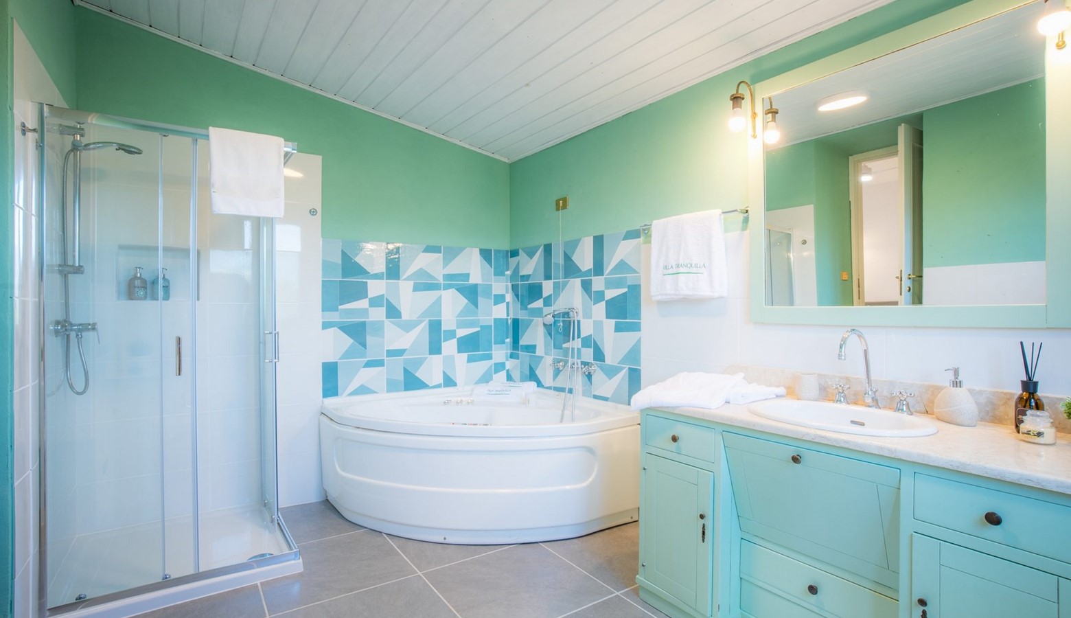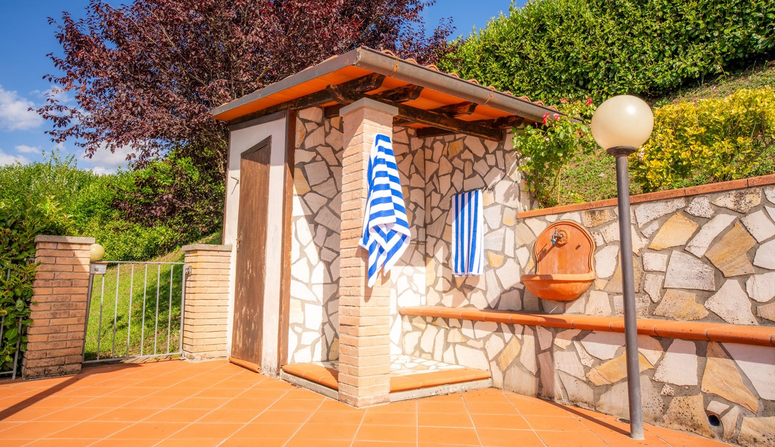 The large private pool with internal steps is perfectly positioned, with glorious mountain views, and is equipped with loungers, umbrellas and a shaded area ideal for relaxing by the water. - Outdoor shower area