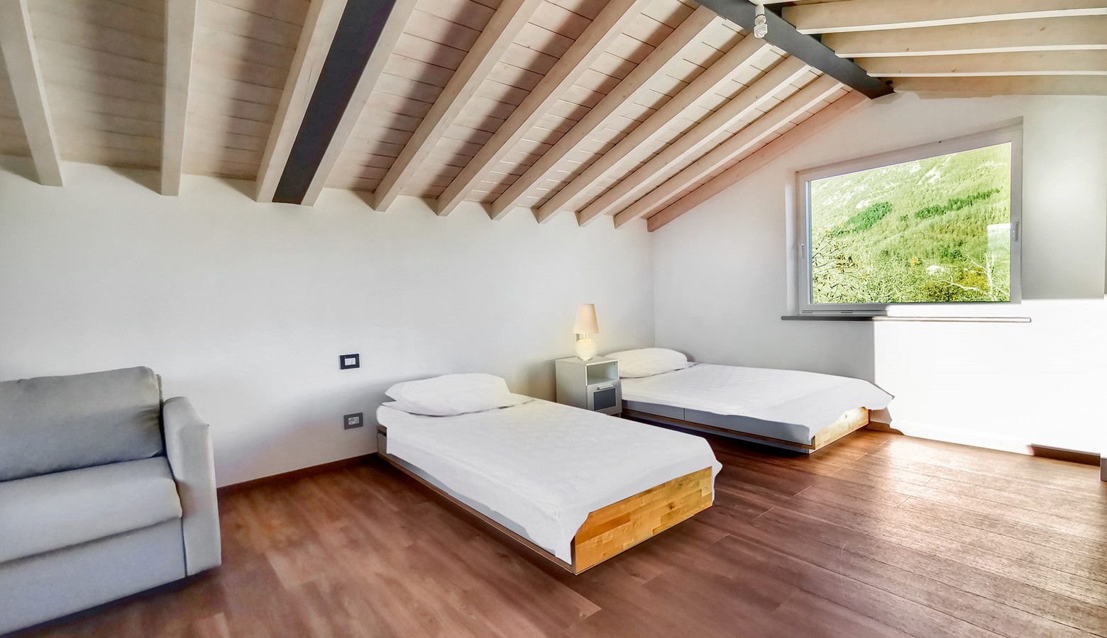 On the first floor is a twin bedroom, loft style with arch beamed ceilings and also with a double sofabed and plenty of clothes storage.
