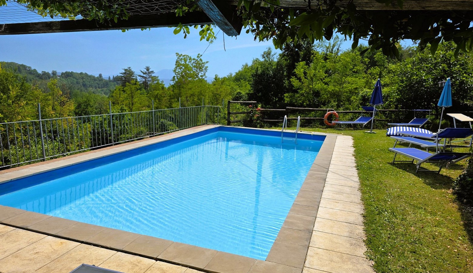 There is a flat play area at the back of the house with swings, and at the front there is a lovely covered eating terrace and bbq looking out at the wondrous countryside. There is also a wood burning bread/pizza oven. Down below and gated for safety, is the small garden and private pool of 9m x 4m which overlooks the green and mountainous countryside..........