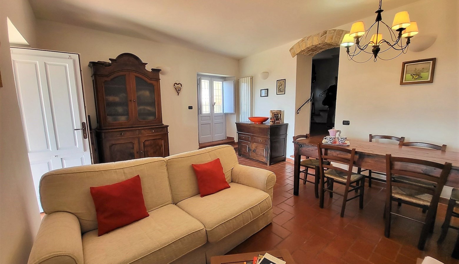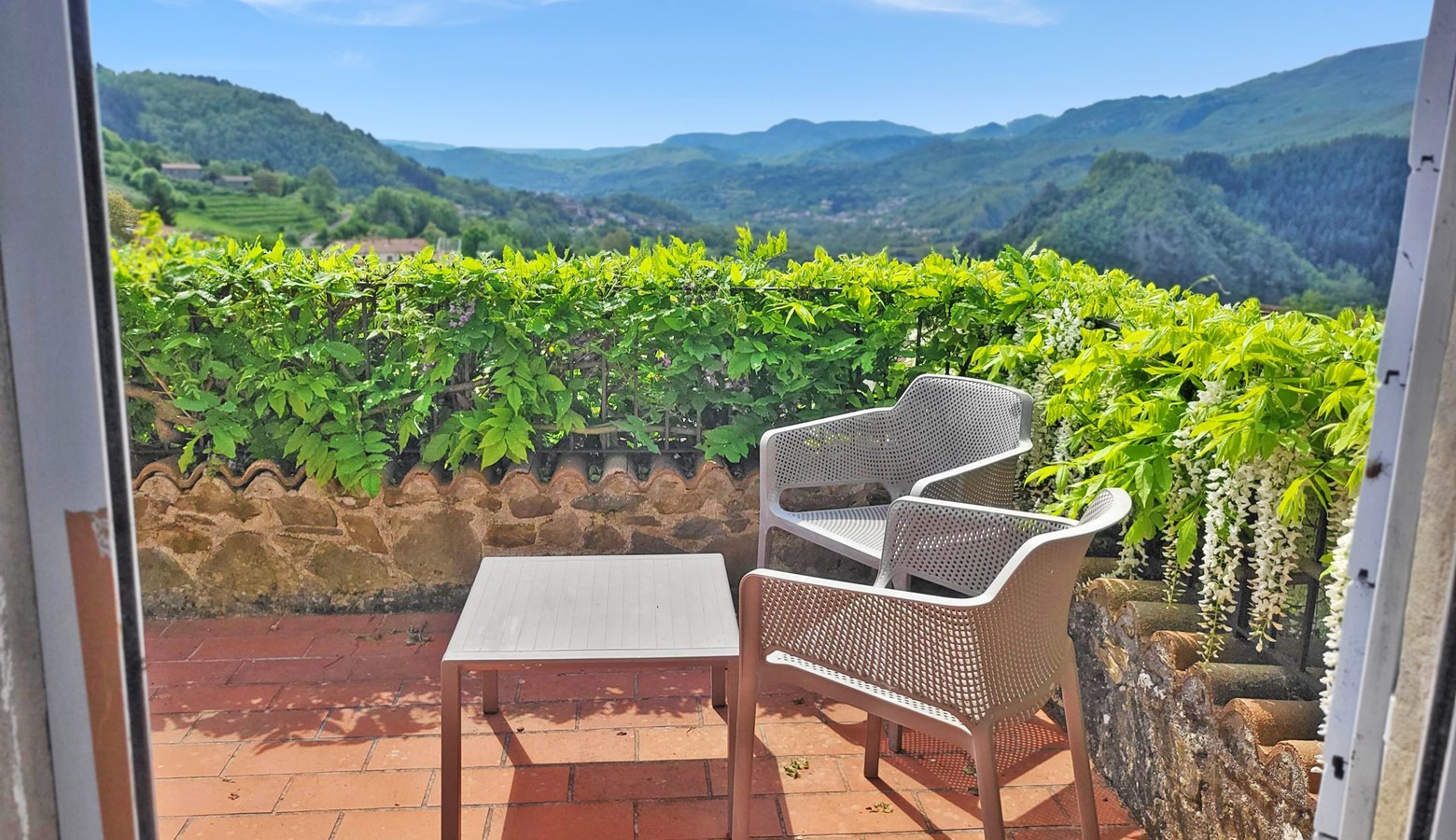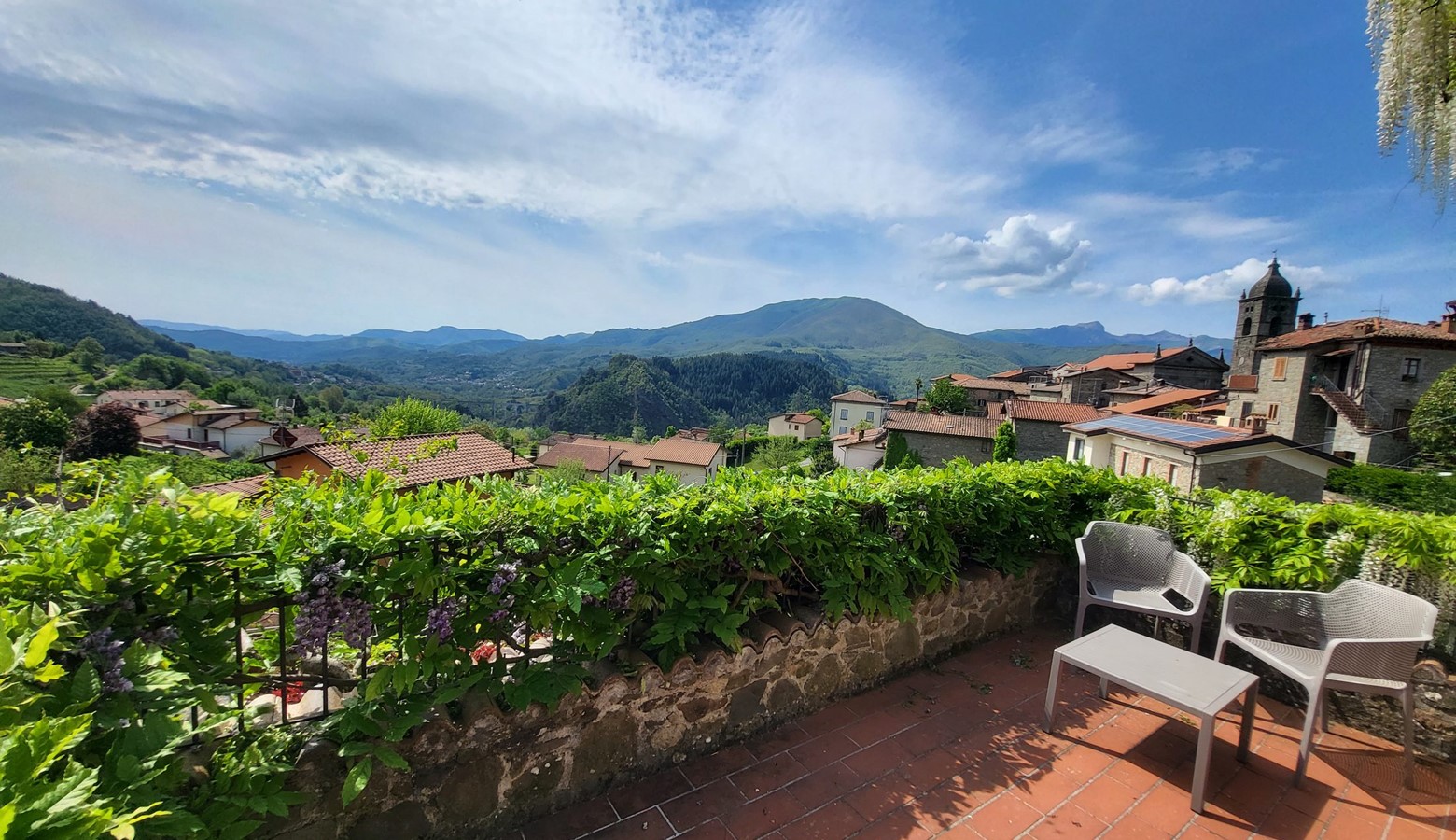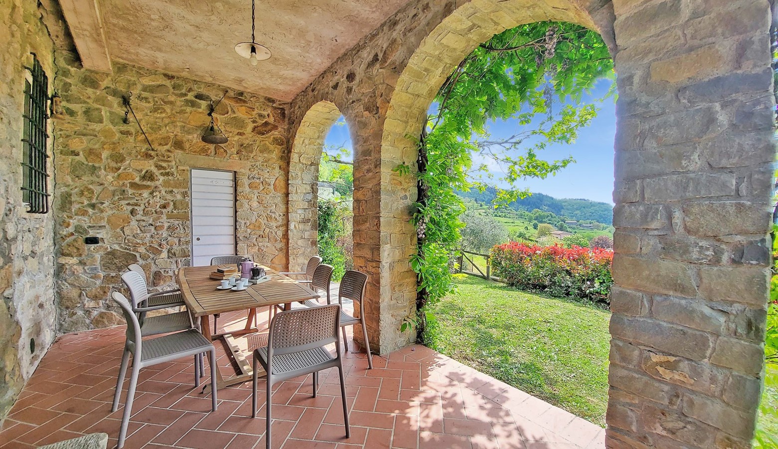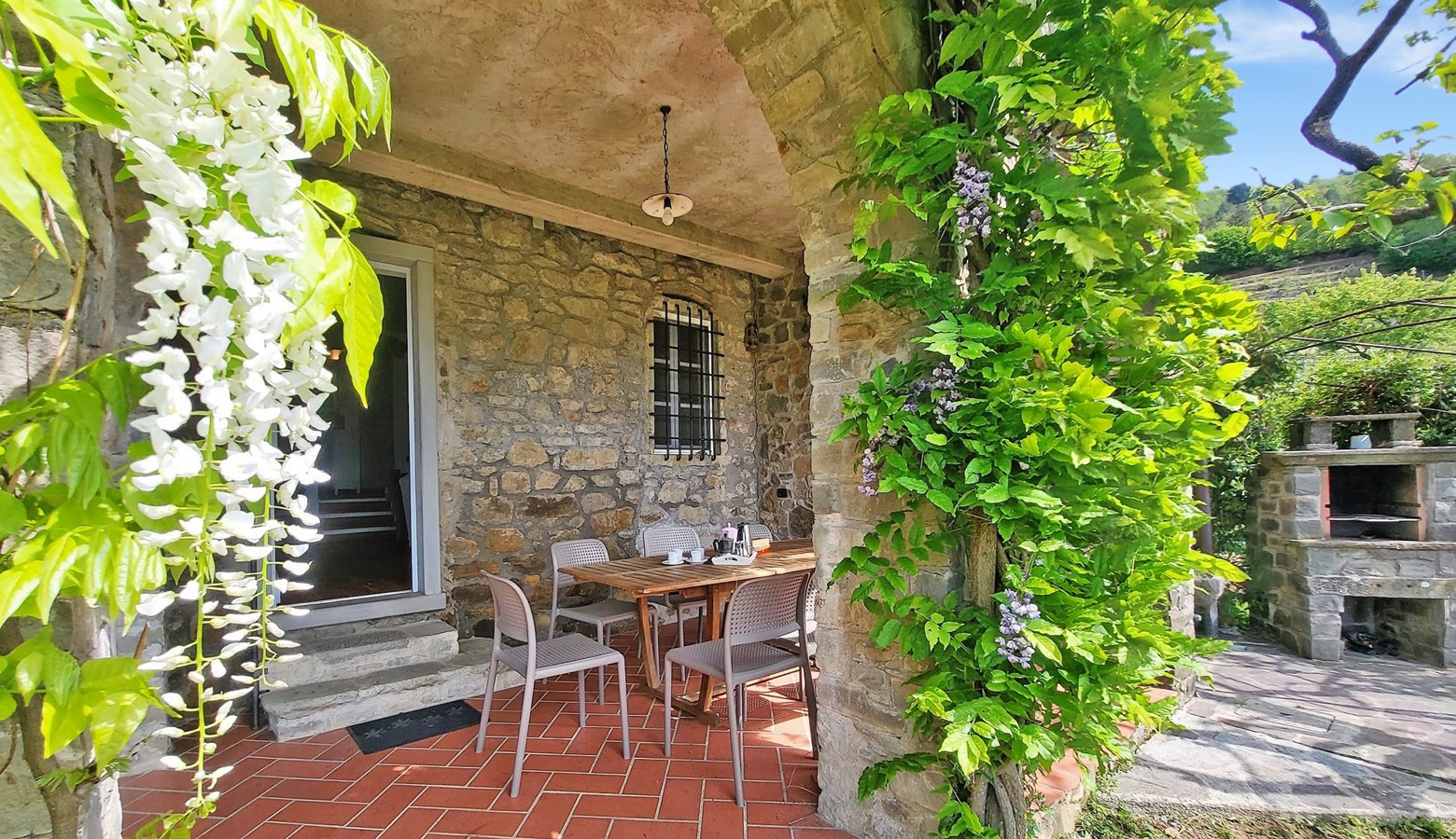 - Beautiful covered traditional arched loggia for al fresco dining and relaxing enjoying the views. Come in May and admire the abundant wisteria, or in June spend the evening with a glass of wine watching the fireflies dancing.