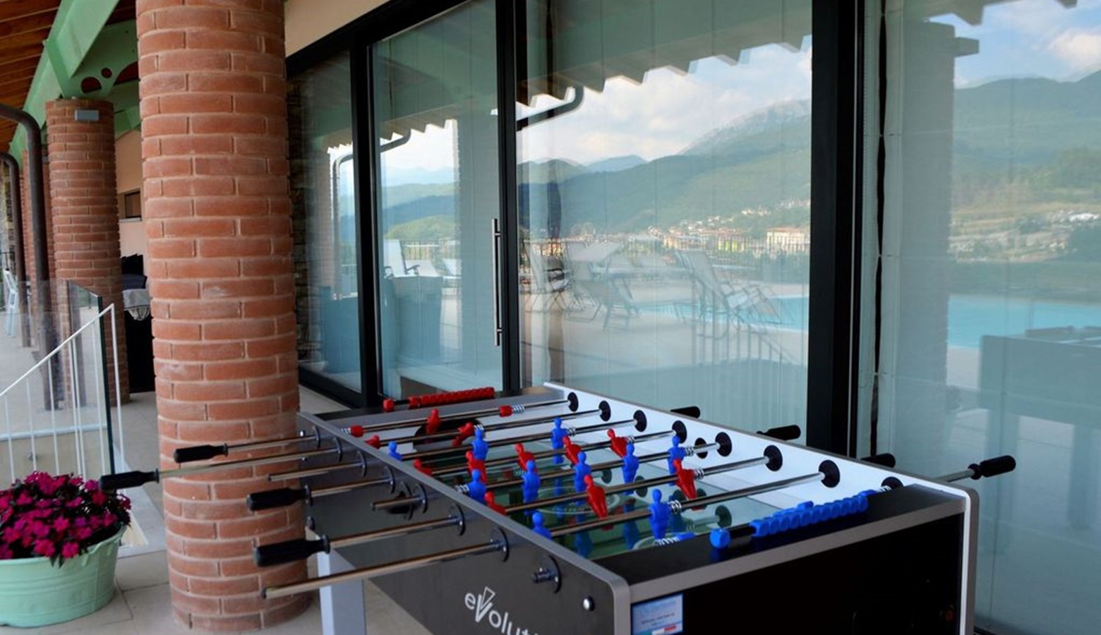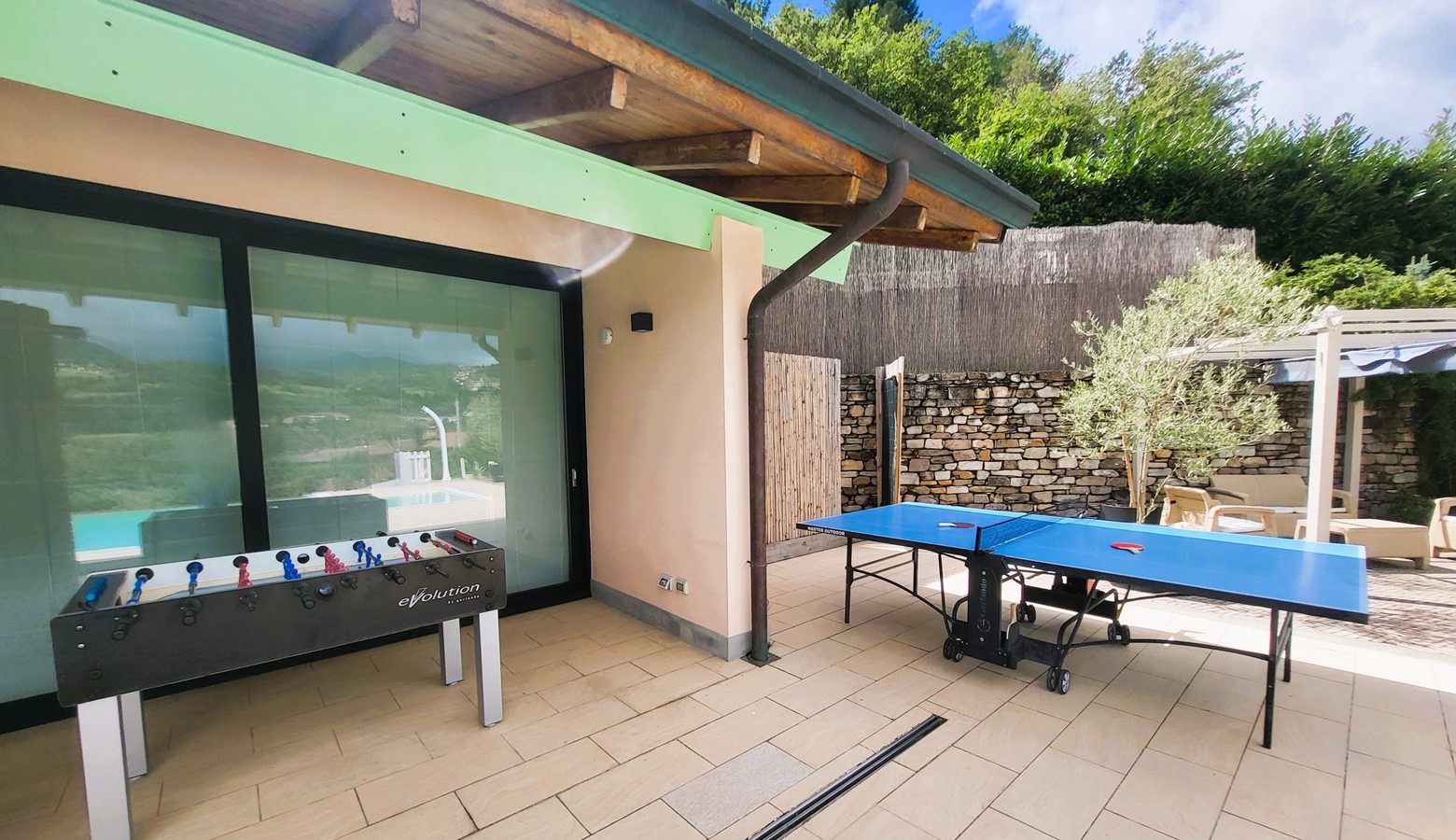 Outside there is a fabulous 12m x 6m infinity style solar heated pool, with roman steps extending the size further. The pool area, overlooking wonderful mountain views, has extensive sunbathing areas with plenty of sunbeds (pool towels provided) and dotted around the villa are various nooks and crannies for relaxing away from the group too with a good selection of outdoor relaxing furniture. If you are feeling energetic there is table football and ping pong.