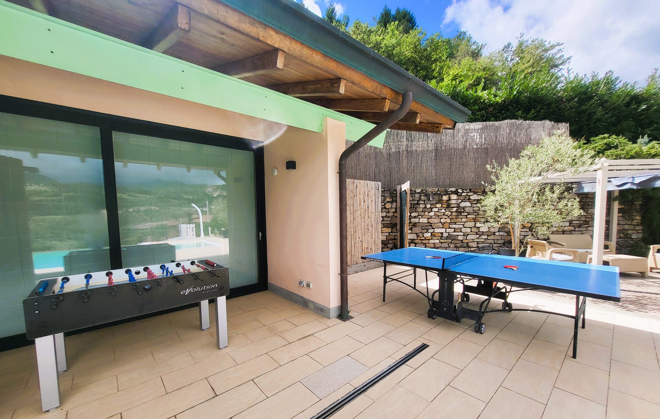 Outside there is a fabulous 12m x 6m infinity style solar heated pool, with roman steps extending the size further. The pool area, overlooking wonderful mountain views, has extensive sunbathing areas with plenty of sunbeds (pool towels provided) and dotted around the villa are various nooks and crannies for relaxing away from the group too with a good selection of outdoor relaxing furniture. If you are feeling energetic there is table football and ping pong.